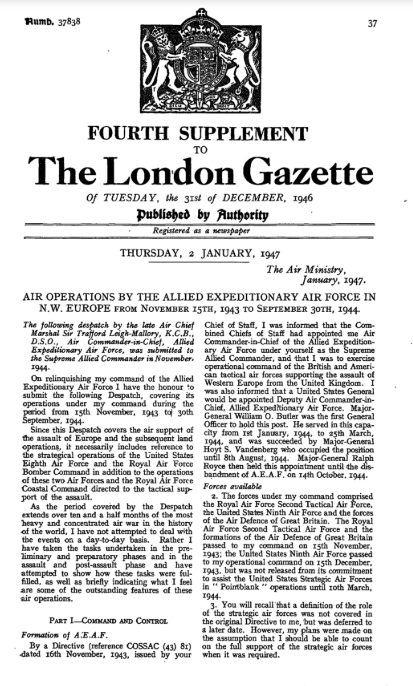 The air operations by the Allied Expeditionary Air Force in N W Europe was covered in the Fourth Supplement to the London Gazette published Tuesday 31 December 1946. The despatch was written by Air Chief Marshal Sir Trafford Leigh-Mallory, Air Commander-in-Chief, Allied Expeditionary Air Force. The Air Chief Marshal’s runs to 56 pages and covers a 10 and a half month period, in the lead up to D-Day and the subsequent month (November 1943 to September 1944). He writes: