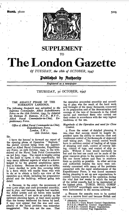 The despatch covers the development of the plan to invade Normandy in 1944, the training and administration, meteorology and weather-induced postponement, minesweeping, the prevention of U-boat attacks, casualties due to mines, difficulties and delays. You will have heard about the Mulberries (artificial harbours), but have you heard of the Gooseberries (craft shelters)?