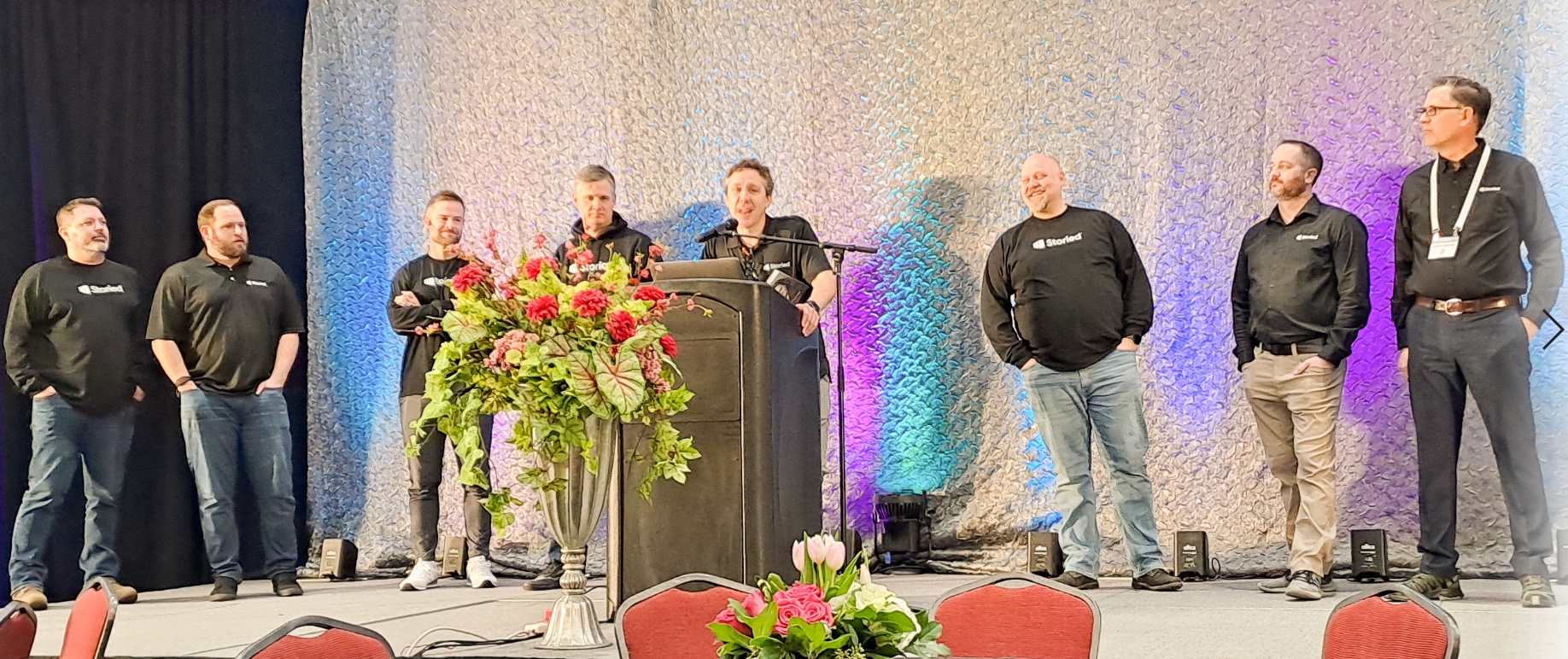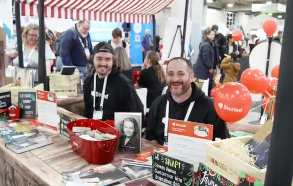 Images: Brandon Camp, CMO Storied, working on the stand; Kendall Hulet, CEO Storied, presenting; Storied books