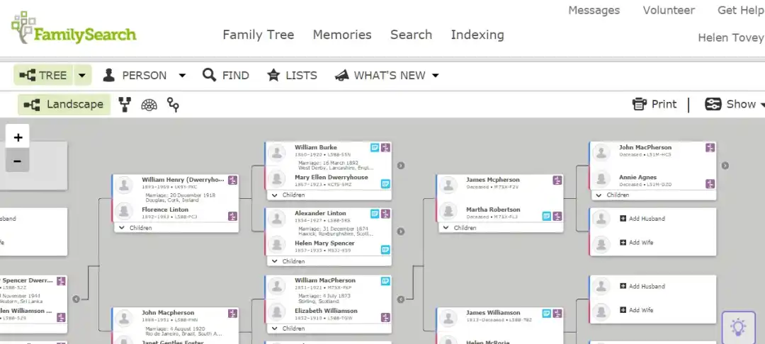 - Select 'Tree' to view your family tree layout with brief details for each person. 'Person' shows editable fields for that individual. 'Find' allows you to search for records. Use the 'Lists' feature to watch for connections of specific people you’re ‘watching’