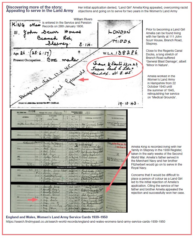 - Concerns that it would be difficult to place a person of colour as a Land Girl led to the initial rejection of Amelia's application. Citing the service of her father and brother Amelia appealed the rejection and successfully won her case.
