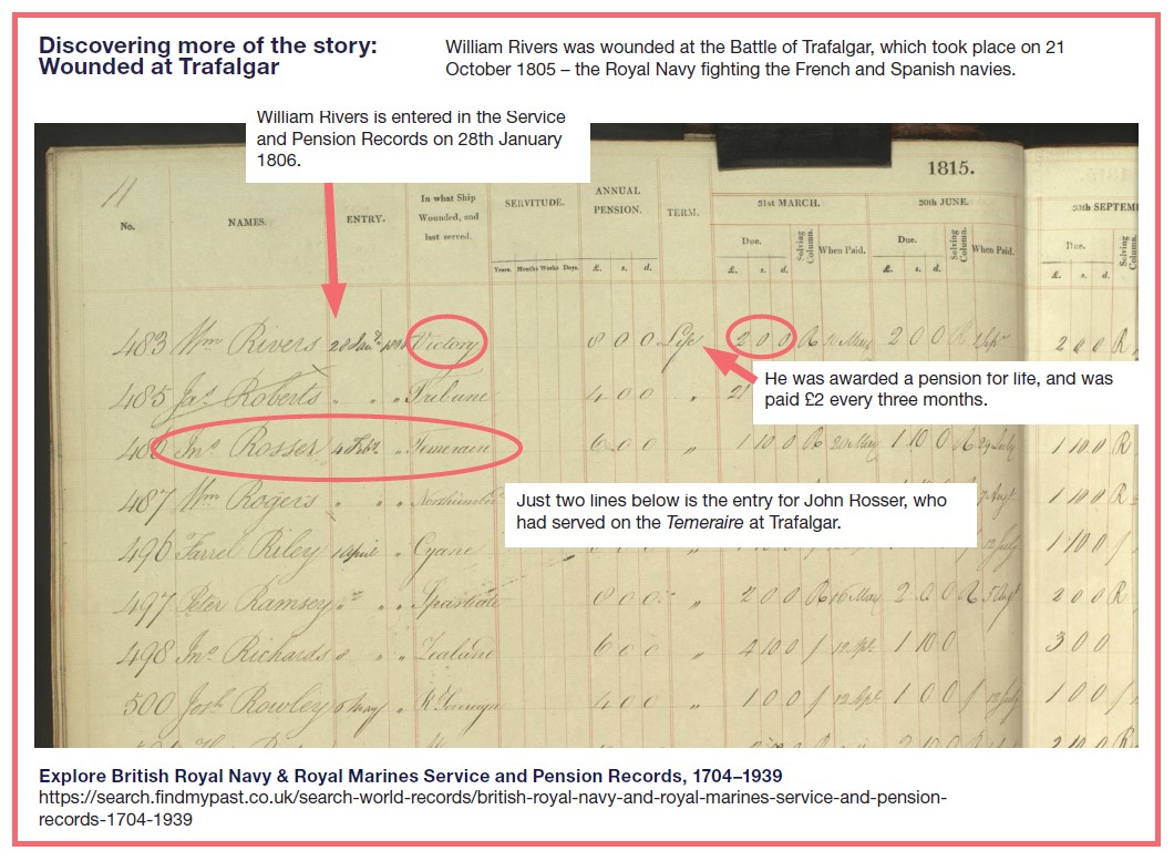 - William Rivers was wounded, while serving on HMS Victory, at the Battle of Trafalgar, which took place on 21 October 1805 – the Royal Navy fighting the French and Spanish navies.