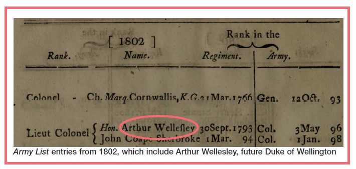 The Army List entry shown below, from 1802, includes Arthur Wellesley, the future Duke of Wellington.