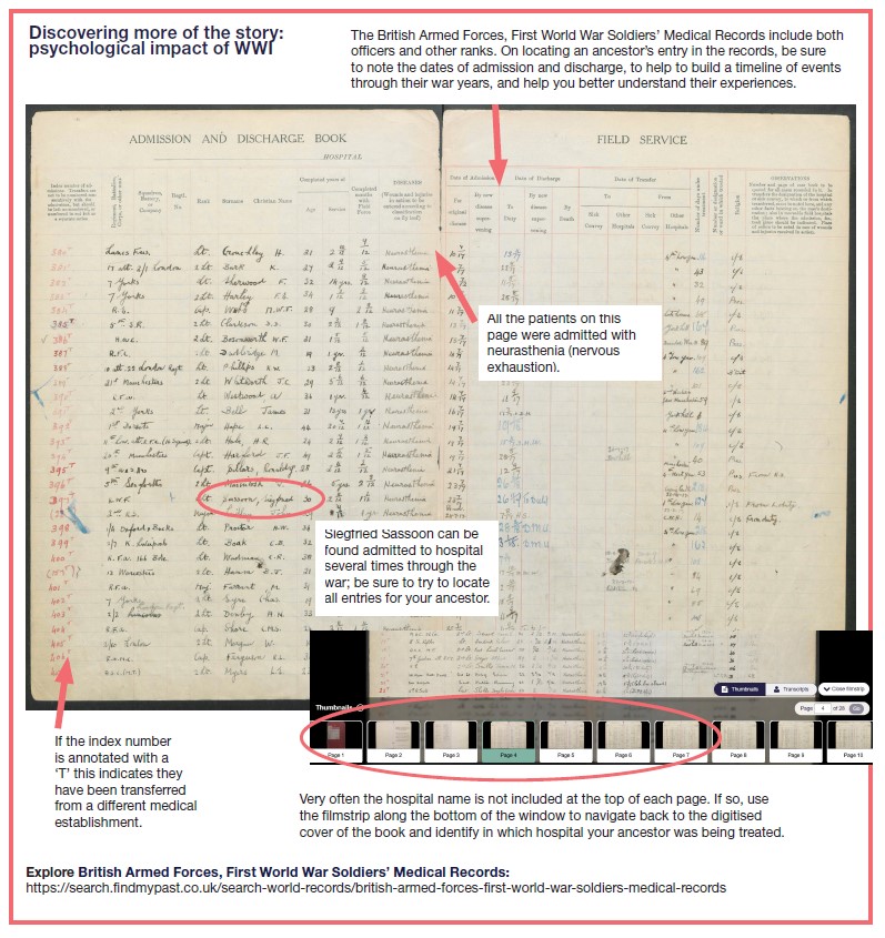 - War poet, writer and soldier, Siegfried Sassoon, can be found admitted to hospital several times through the war; be sure to try to locate all entries for your ancestor.
