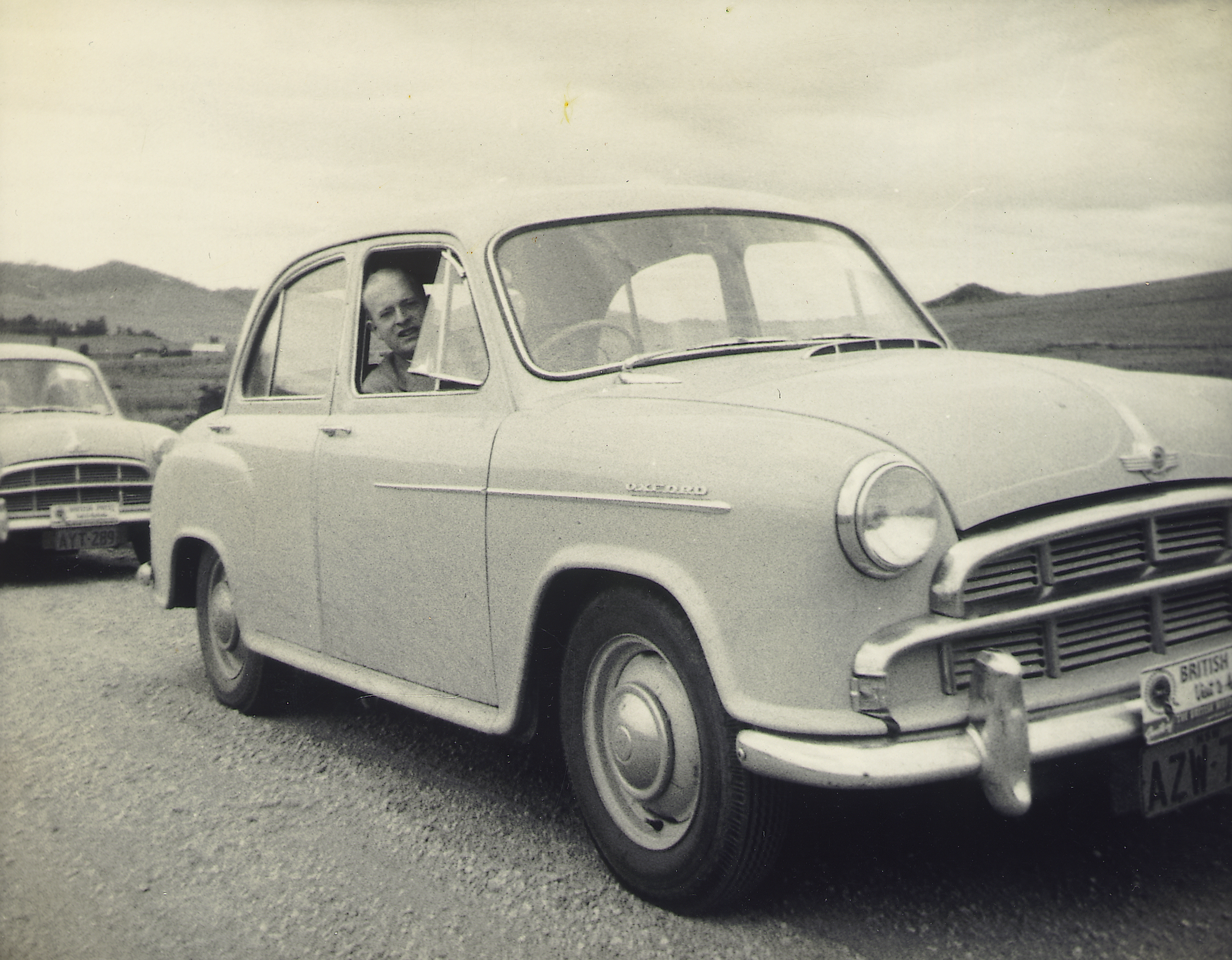 Ron Wilcox driving a Morris Oxford up to the Snowy Mountains on a press visit to Australia in 1956. (Pictorial Record of the British Press Visit to Australia, February – March 1956. The British Motor Corporation (Australia) Pty. Ltd)