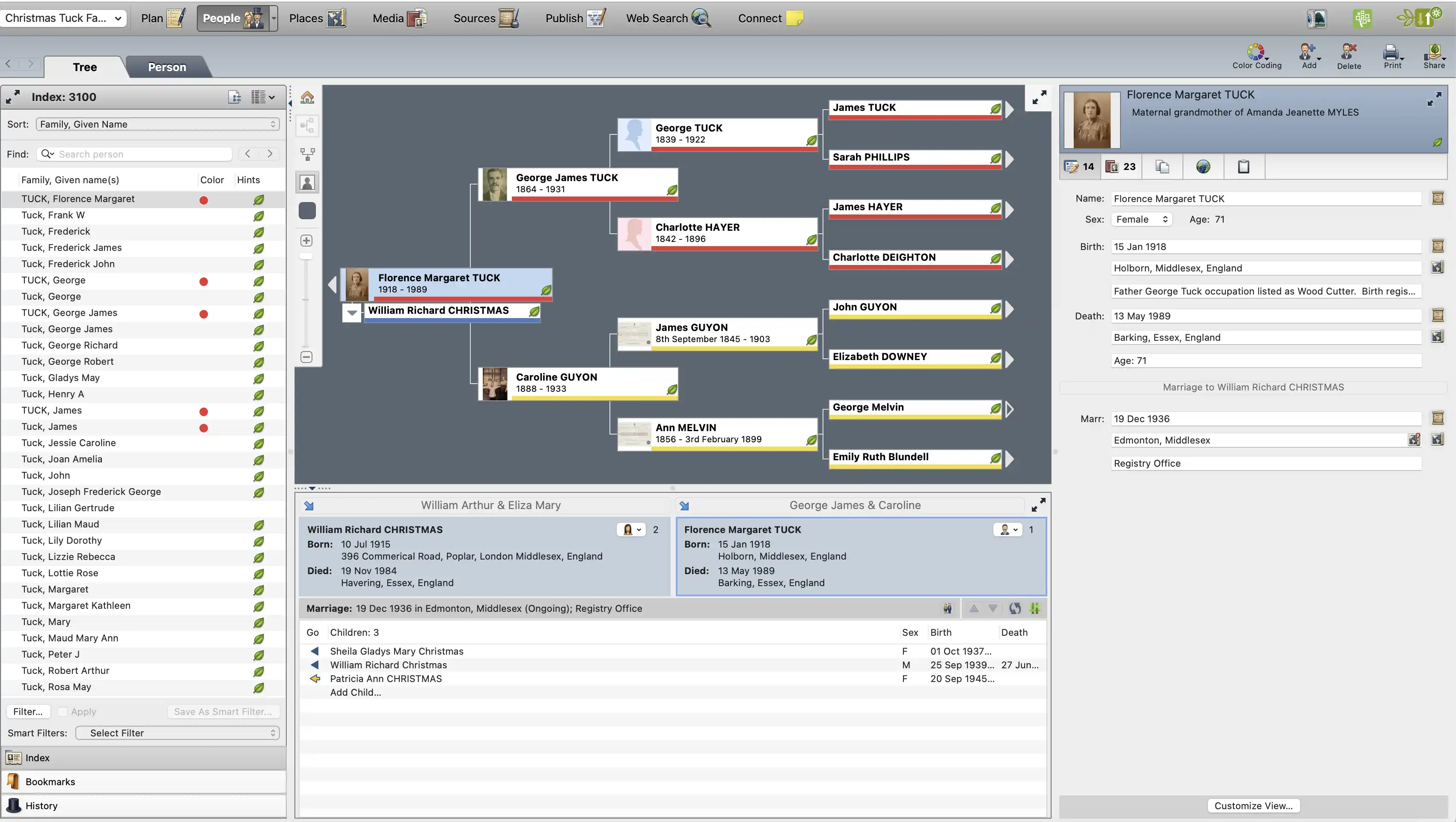 In the People workspace, choose from the Tree View (shown here) or the Person View, and, within the Person View, three options: Facts, Timeline, and Relationships. The Relationships tab displays family details such as parents, spouse, and children.