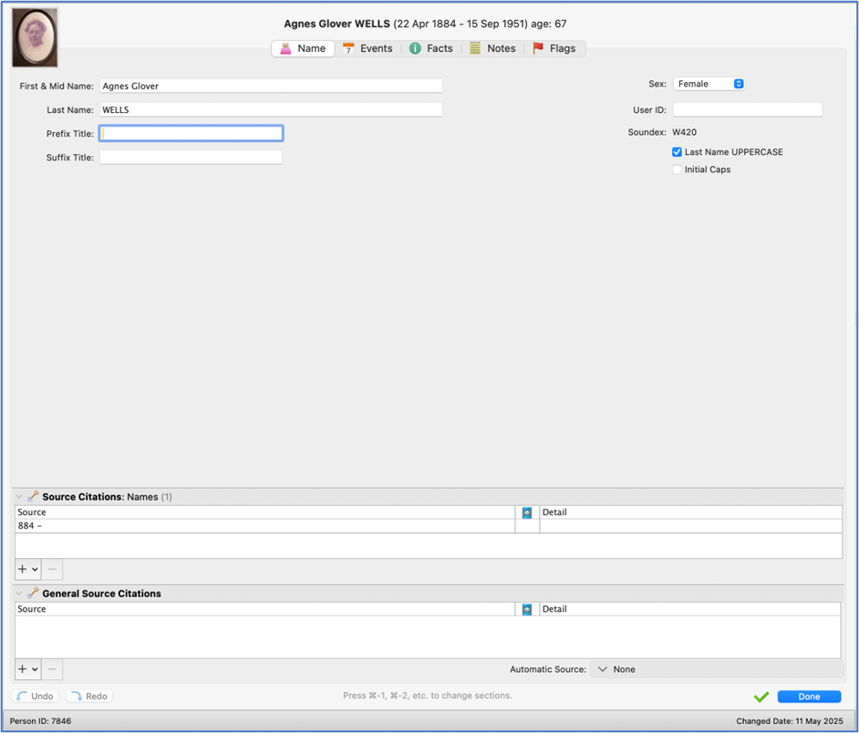 Edit screen: The edit screen (above) includes tabs to change the name, events, facts, notes and flags. Reunion displays the last change date for the person at the bottom of the screen.