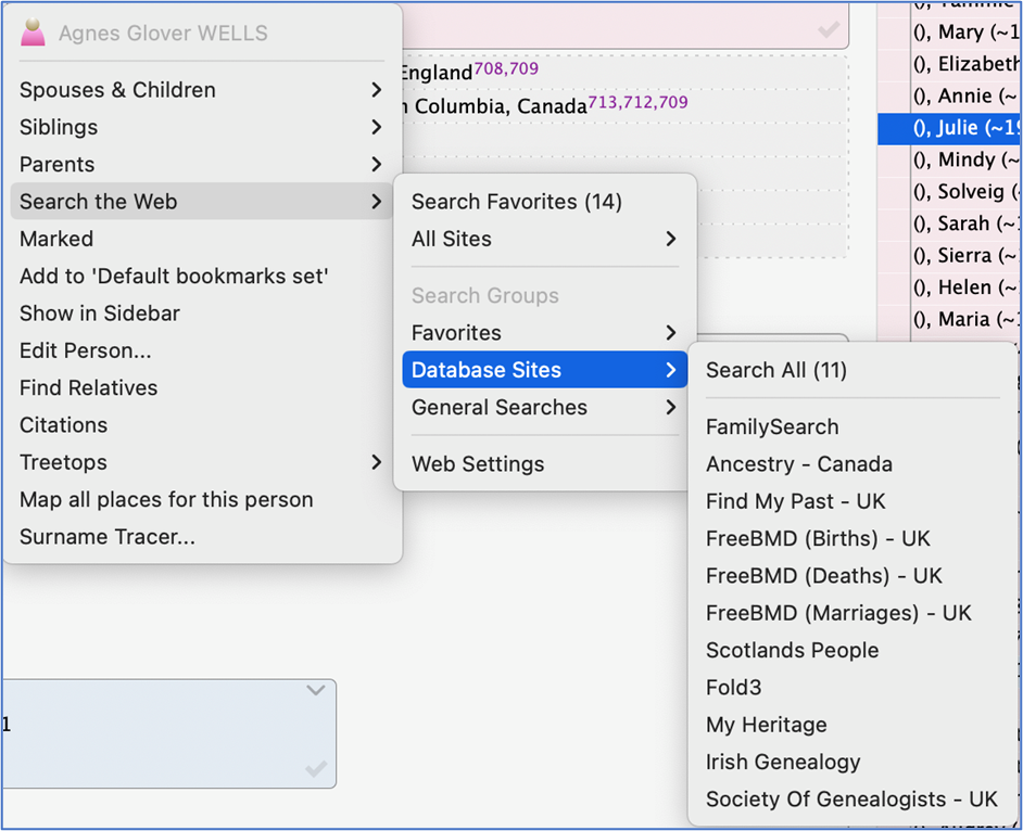 Searching: You can search a number of sites directly from Reunion by simply right clicking on the person and selecting the site.