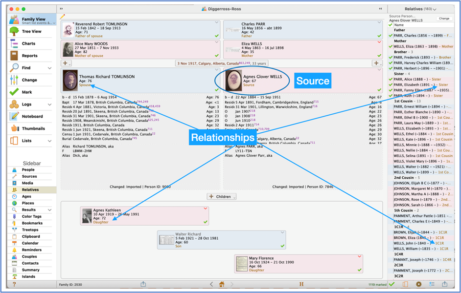 • Family View & Tree View: There are two main screens for navigation, the Family View and the Tree View. You can jump between them using the Navbar. Family View from Reunion 14 (ie the desktop/laptop version) is shown in the example above.