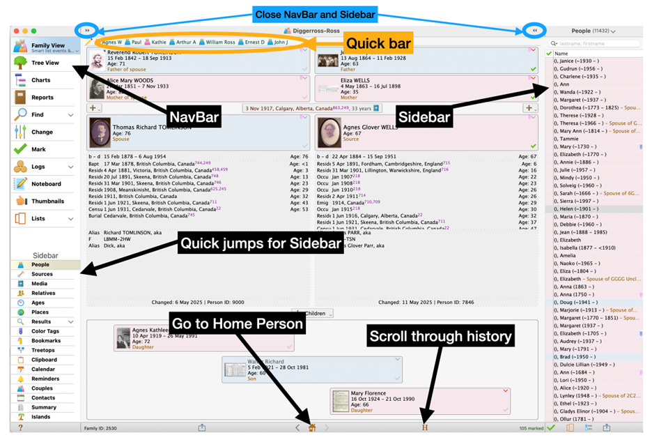 • Both the NavBar on the left and the sidebar on the right) can be closed for extra space for the Family and Tree Tiew if you wish.