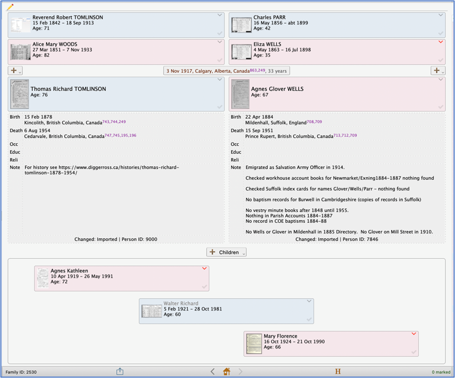 Marking: I already use colour tags to mark ancestors of myself and my husband, so I wasn’t sure there was a good use for the marking function. However, I have found many uses for it since starting to use Reunion.