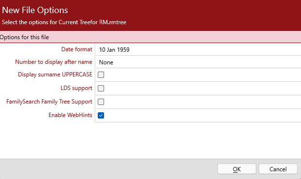 In the new file options section (Figure 2), I noticed that it had web-hints enabled. RootsMagic provides hints from Ancestry, in lots of detail, then less detail for FamilySearch, Findmypast and MyHeritage.
