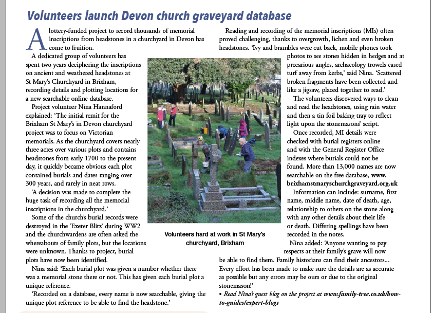 Online access to the searchable database will also be available through Devon Family History Society, and websites such as Genuki and St Mary's Churchyard website.