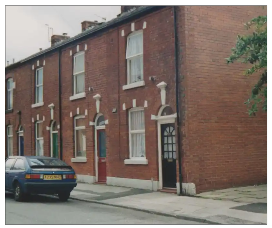 PHOTO: Endeavour Buildings Ashton Under Lyne, Lancashire, built 1877. In 1881, Adèle's widower joiner 2x great grandfather plus eight children were squeezed in one house. Photo taken 1997. © Adèle Emm