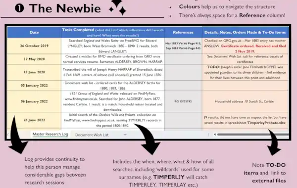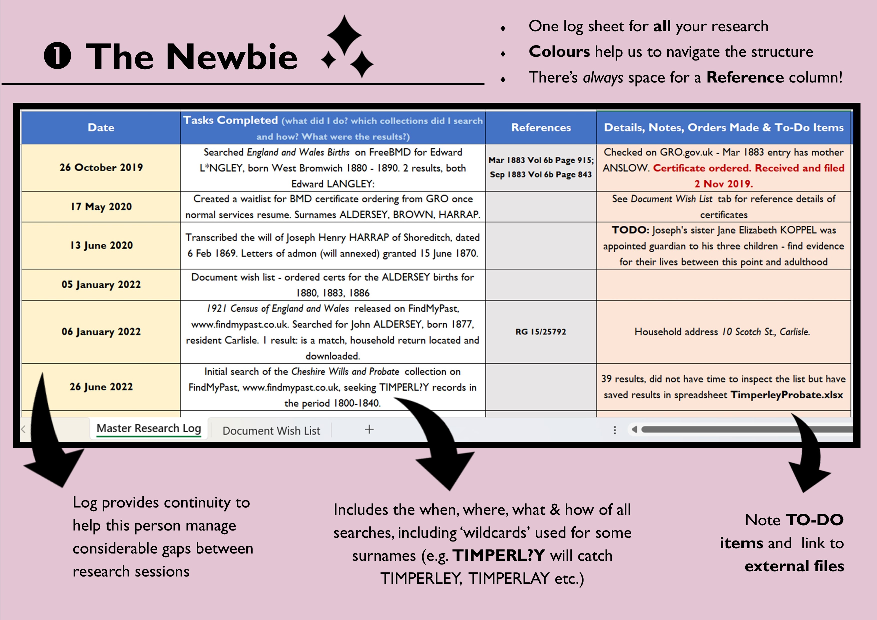 "If you’re not used to keeping one then this might sound like an intimidating prospect, but it needn’t be. I promise you it’s entirely achievable and brings a wealth of benefits to your family history! So let’s delve into the WHY of the research log…"
