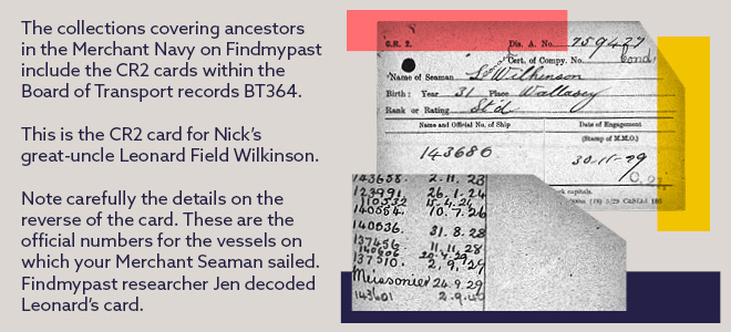 ‘From Findmypast I found a CR10 Merchant Seaman card for Leonard Field, which I believe is a form of identity certificate issued during the First World War and the date on the record was 1918. I also found his CR1 and CR2 cards on Findmypast too. The CR2 card has a list of Merchant ships he served on (by registration number) post-WW1. I would like to understand a bit more about these cards.'