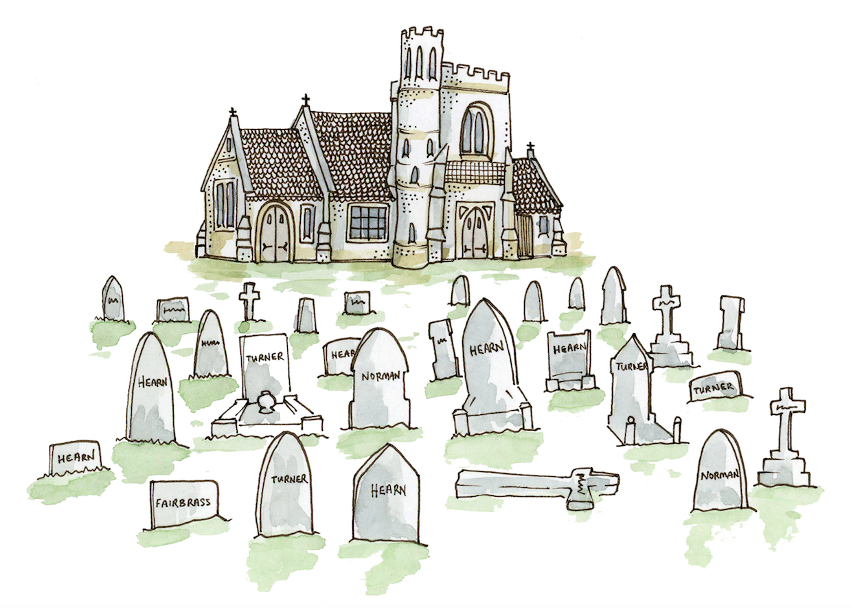 ‘They range from Francis Gliddon Hearn, who is my 4th great-grandfather. He died 1907 aged 84 but there is no headstone to mark where it is. He is not the first of my ancestors buried there, that honour goes to my 3rd great-grandmother. She was Mary Hearn née Watson, buried there in 1899. The last one buried there is my great-uncle William J Turner, who passed away in 1995. He is buried with his son but is not marked on the headstone. They range from third great-uncle to 1st cousins 3x removed. I have 15 Hearns, four Turners, four Fairbrass and two Normans, etc.’