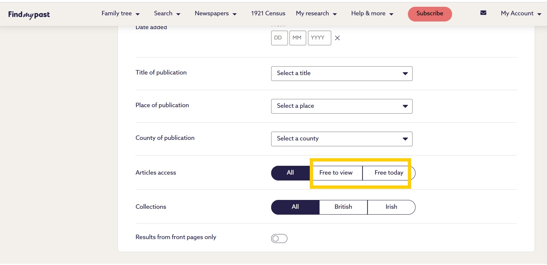 Are there any free newspapers? Yes Findmypast set itself a target to provide access to selected digitised newspapers completely free of charge. 4 million such newspapers may be now searched free here. To make sure your search results return free access digitised pages, scroll down to the bottom of the Advanced Search form (accessible in the link just given) and select 'Free to access' or 'Free today'.