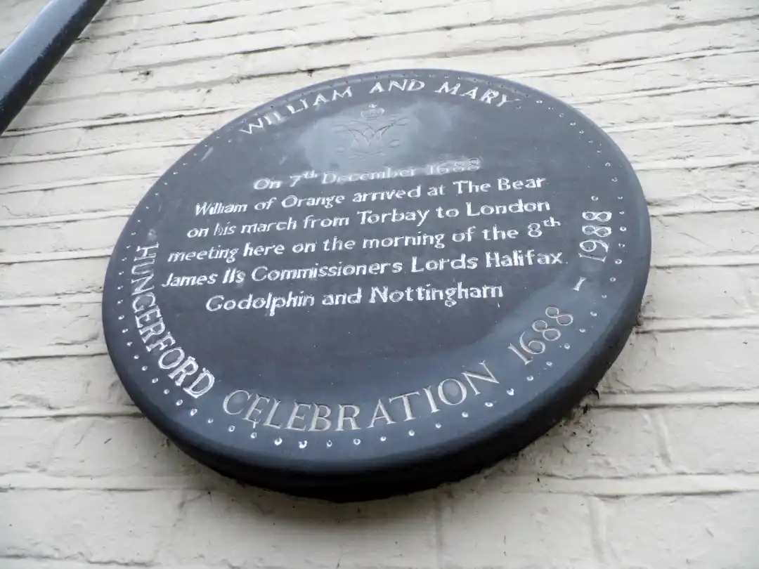 Wind back four months and I was in Hungerford for nothing more taxing than a football match. Funny how the Stuarts follow me about though. When I arrived at ‘The Bear’ (my hostelry for the night) I was delighted to find a plaque on the front of the building. ‘On 7th December 1688 William of Orange arrived at The Bear on his march from Torbay to London …’ No way.