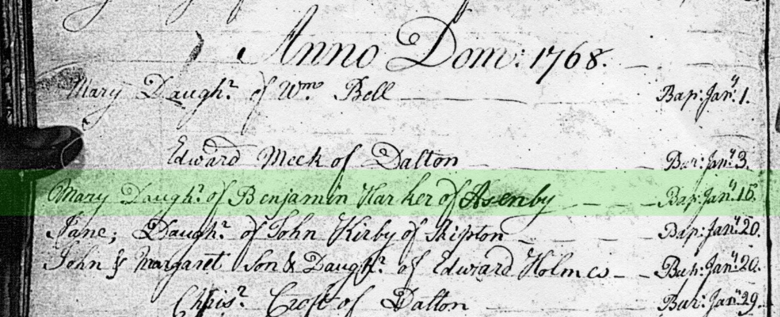 As a general rule, English parish registers recorded baptisms rather than births at this time, and as the average age at baptism had increased from one week old in the middle of the 17th century to one month by the middle of the 19th century, working backwards we can assume that Mary was born toward the close of 1767 or early 1768.