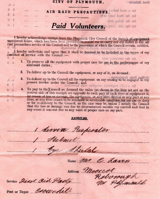 I have his record of the issue of his ARP kit and on the reverse are the prices which he would have to pay should be need to replace items. He had to attend the evening ARP unit in Crownhill every night, two miles away, after having worked all day and eaten a quick evening meal. Grandad, who had fought in the First World War and who was 64 at the outbreak of WW2, also joined the ARP and used to cycle from Maristow, leave his bicycle with us and ride pillion on Dad’s motorcycle to Crownhill. When the Luftwaffe started bombing Plymouth in earnest, it was not unusual for Dad and Grandad to spend all night in Plymouth, rescuing people from burning buildings, giving first aid and helping to put out fires, before coming home for a quick breakfast before Dad had to return to the dockyard to work all day. This became commonplace. Grandad had a poacher’s folding .410 shotgun clipped to his cycle crossbar and often shot rabbits on his trips to and from Maristow and Roborough. There was hardly any meat available from the butchers but, thanks to Grandad, we ate a lot of rabbits! I never cared for rabbit meat at all but we were hungry and I learned to eat a lot of things which I have, thankfully, been able to give up since. Lead shot which escaped detection until it appeared in the mouth was particularly nasty and didn’t do our teeth any favours!