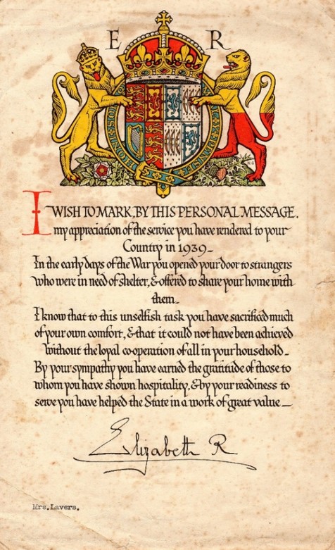 I can remember all those smelly feet and sometimes I fell asleep with someone’s dog. I would often sneak upstairs and watch the inferno that was Plymouth from our window at the top of the stairs. We were five miles away from the city centre but it was very clear indeed and the noise and flames were too close for comfort, with burning debris falling everywhere when the wind was from the south. The oil tanks which contained vital fuel for our ships were bombed and they burned for many nights, which gave the Luftwaffe a clear picture from above. It was as though there was no night, only an orange day. The anti-aircraft guns would fire something which Dad called flaming onions, tracers to show the gun crews where their shells were going. These would have been a fantastic fireworks display but it was all too horribly real. I can still see them in my mind’s eye, as real as if it were last night. I have never enjoyed fireworks since those times. In the morning, before daylight, our guests would gradually leave and make their way home, hoping their home was still standing where they had left it. Nothing was ever taken. Nothing went missing. There would always be some cash left behind on the sideboard, for the tea and sandwiches. Our Queen later sent out certificates to all those who had opened their doors and offered shelter to the less fortunate and Mum received one.