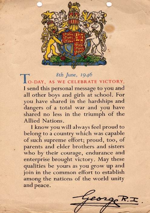 Whenever Winston Churchill was going to speak on the radio we were given advance notice and everyone listened attentively and we all hung on his every word. Whatever the situation during the war, Churchill always gave us a positive message and certainly gave us reason to hope, despite the bombs and problems all around. He never made false promises but we always felt refreshed and excited after hearing this great man who certainly knew the power of words. I grew up with both his speeches and the encouraging Christian messages from our King and Queen, who we all loved very much. I remember when the war ended how we celebrated in our little village. A field was set aside for games for us kids and the Royal Navy brought swings and roundabouts, etc and hosted the village on a Saturday. I remember that each event cost us kids a penny and I ran out of money after an hour or so. I ran all the way home and asked Dad for more cash, which he gladly gave me, all in bronze pennies and halfpenny coins. Off again I went and spent the lot, of course. It was a wonderful day for us all, after the stress and strains of our wartime existence. The village collected money from all the households and Victory in Europe (VE) mugs were given to all the children, ordinary drinking mugs which were painted on the side. We thought they were wonderful!