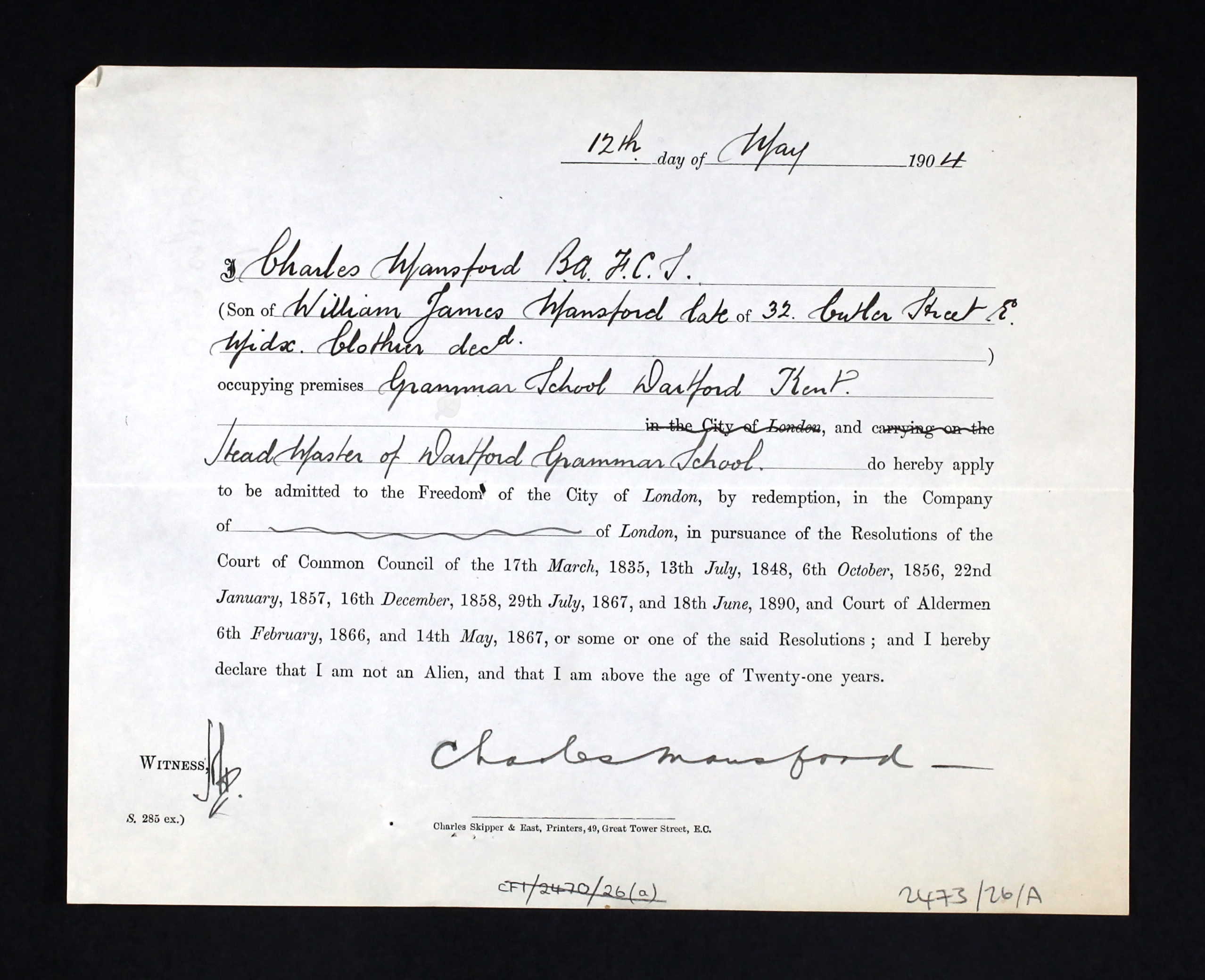 It was through his application for the Freedom of the City that I was able to establish that Charles John Jodrell Mansford was indeed my 2x great uncle Charles Mansford.