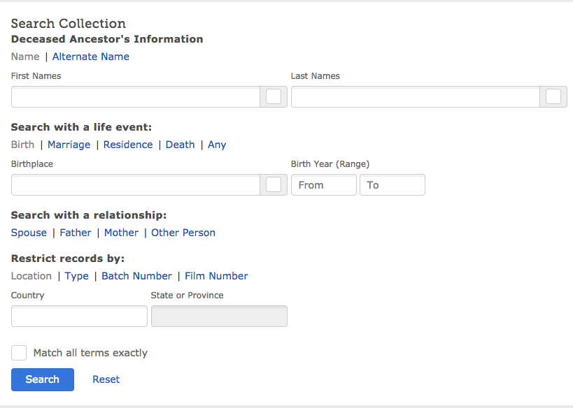 Baptism, marriage and burial records are included and you can search with terms including ancestor's name; life event - eg birth, marriage; or relationship, eg spouse, mother.