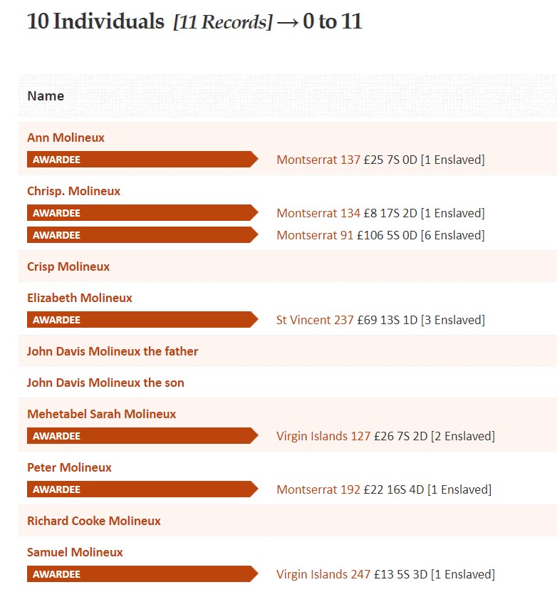 An example of a search result, showing the amount that the owner, Ann Molineux was awarded in 1836 in compensation for the freedom of her slave.