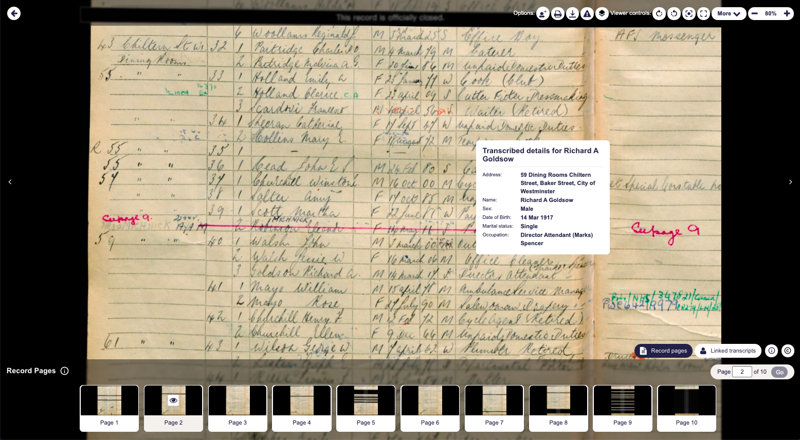 - Easier access to transcripts - Where an image has transcripts available, Findmypast now enables users to access any transcript for a person featured in that image from within the viewer itself. This enhances users’ ability to ability to see what names are included in any given image, particularly helpful in cases where old handwriting may be difficult to read. This is available on many record sets such as the 1939 register, Crime and Punishment record set, Passenger Lists etc
