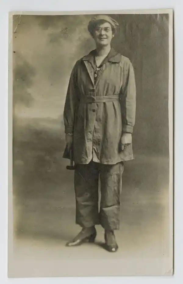 Postcard (front) of Dorothy Frances Curtis of Cardiff (1918). Source: Glamorgan Archives Ref. DXFX/19. Note: Photograph of Dorothy Frances Curtis of Cardiff, employed on war work and dressed in protective clothing, including trousers, as a supervisor in a munitions factory where girls packed explosives into shell cases, in Birmingham. The rear of the postcard is signed 'Trousers' as this is likely to have been the first time that Dorothy had worn trousers.